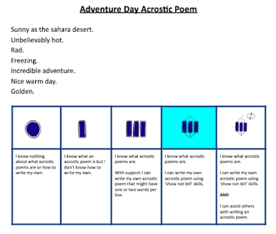 This week we have been writing acrostic poems about our Adventure Days. We have been focussing on being descriptive and using language features.